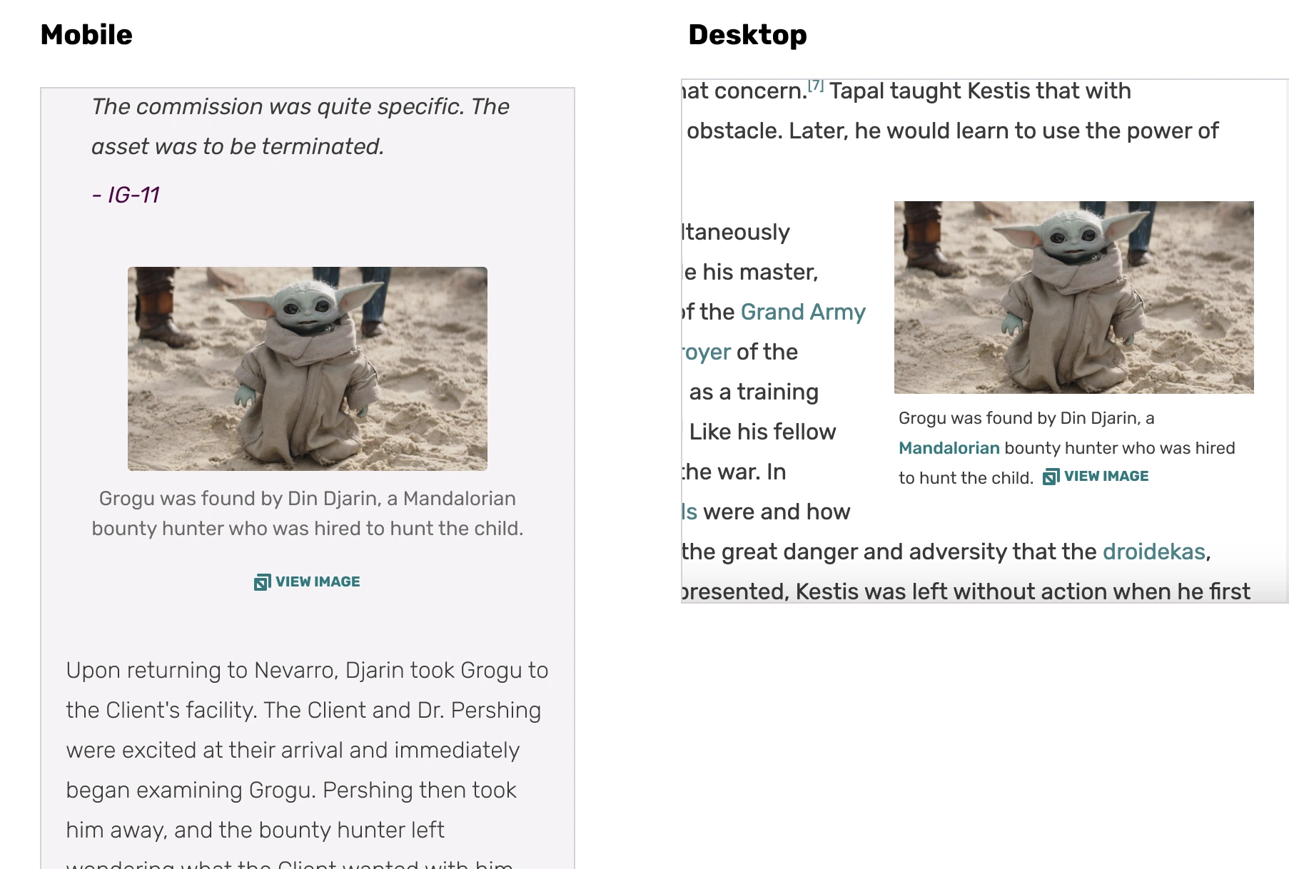 Premise: We are adding a View Image link under images to lead anon users to the gallery. We experimented with the idea that creating a visual entry points for anon users would increase understanding that images are clickable. We tested a few different options, such as adding an icon on the image itself, and found that the View Image link underneath the image created the most understanding without being intrusive to the image.